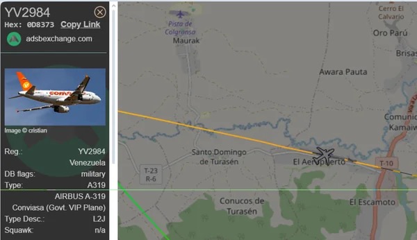 Na tarde desta sexta-feira (29), um avião oficial da Venezuela foi rastreado sobrevoando até a região de Santa Elena de Uairén, cidade próxima à fronteira com o estado de Roraima, no Brasil. O Airbus A319, matrícula YV2984, é operado pela estatal Conviasa e classificado como uma aeronave VIP do governo, já utilizada em viagens oficiais do presidente Nicolás Maduro.